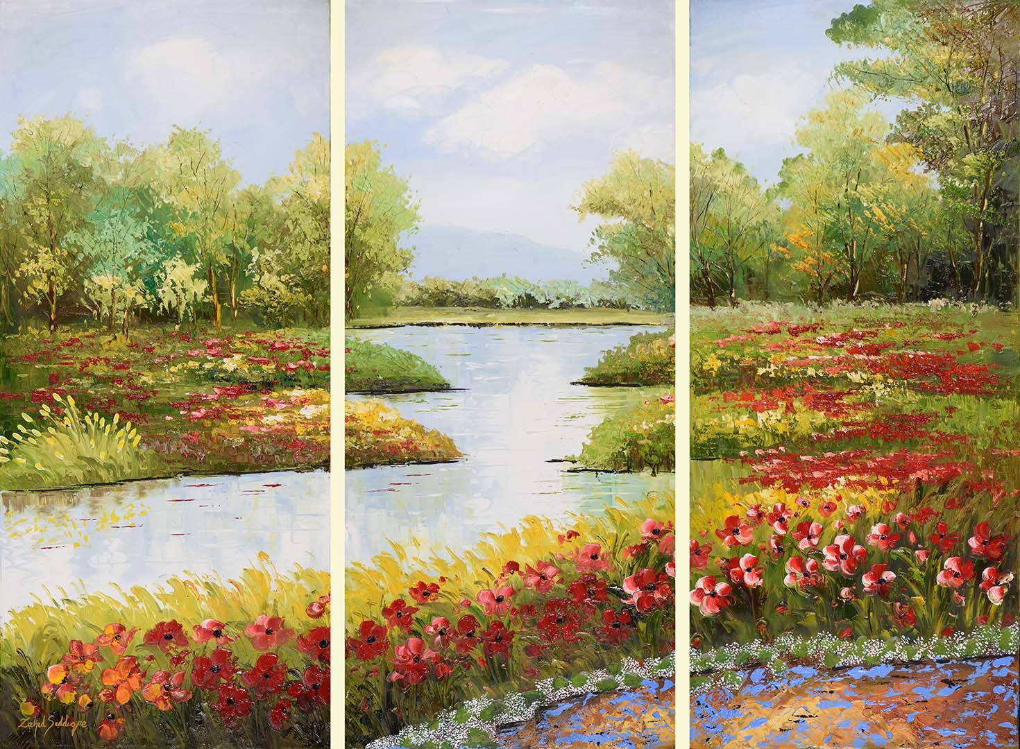 This luxurious work of art will add a touch of sophistication to any wall in your home. "Sanctuary of Souls" invites the heart into a sacred haven where nature and spirit unite. Blossoms flourish by tranquil waters, trees whisper of eternal harmony, and the landscape becomes a gentle refuge for love, peace, and timeless connection."
